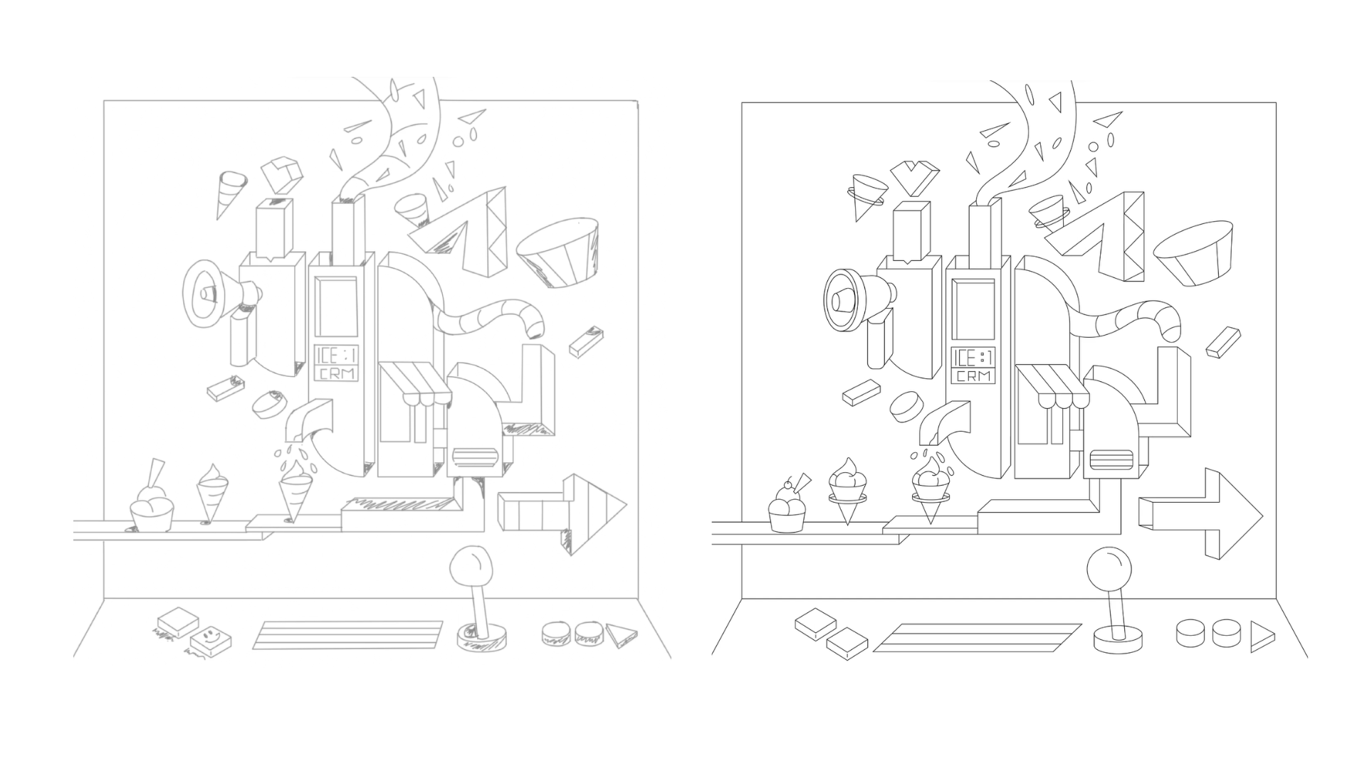 From brainstorming to sketching initial concepts, we felt one of the best ways to achieve this result was to incorporate the brand mark with an ice cream machine. Our Initial doodles featured the 9H brand mark morphing into a delicious swirl, setting the stage for an epic transformation. By giving the brandmark a 3D appearance, we were able to enhance its visual appeal and provide space for additional elements, which depicted the initial stages of the ice cream-making process unfolding inside the machine.
